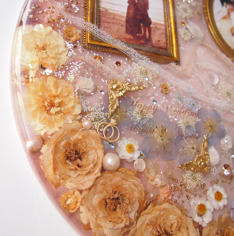 バラはウェディングブーケをお願いしたお花屋さんで似たものを入手し、あえてセピアカラーのドライフラワーにして二人の想いや記念のものをレジンに封入。